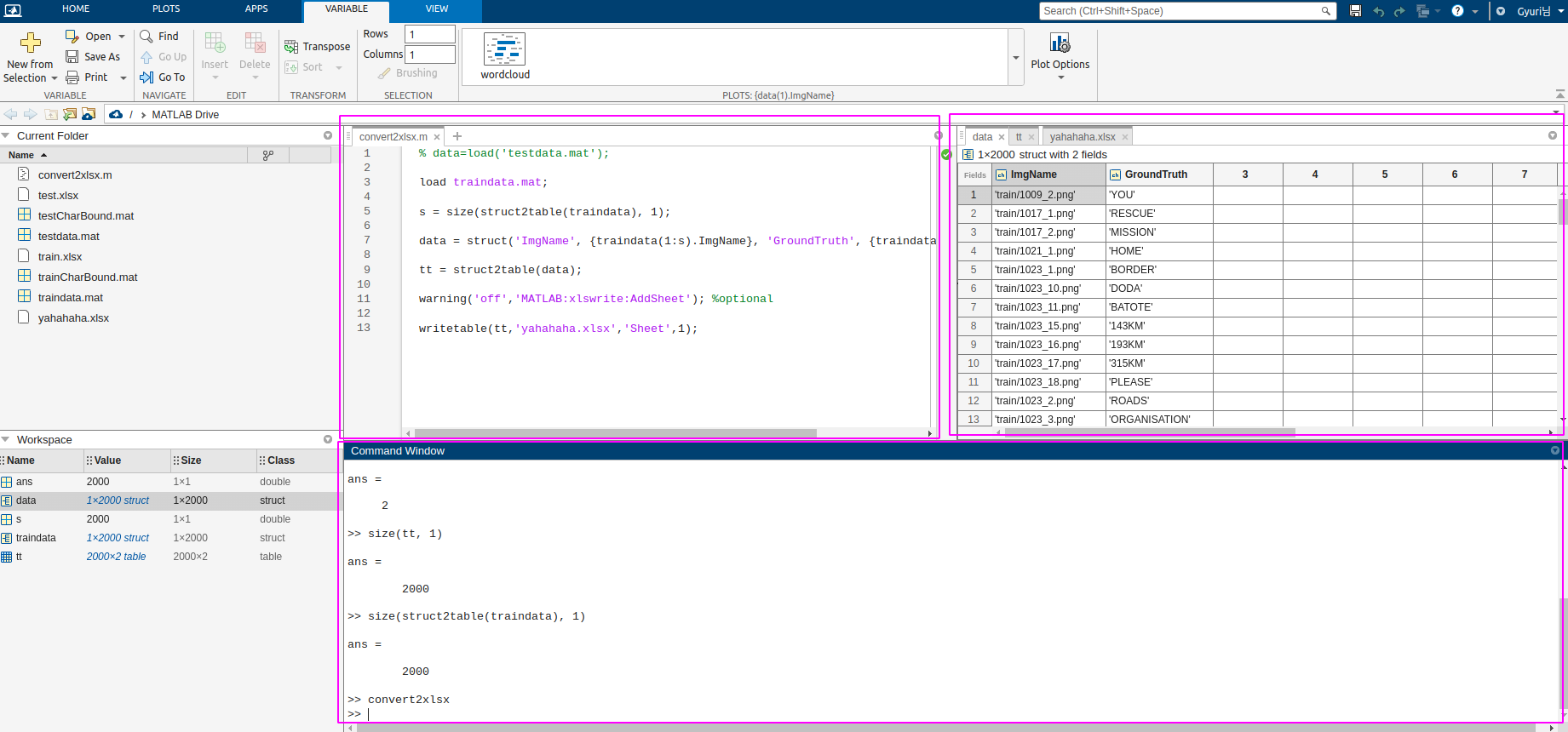 11. Workspace에서 실행하여 저장된 변수들의 정보를 볼 수 있다.