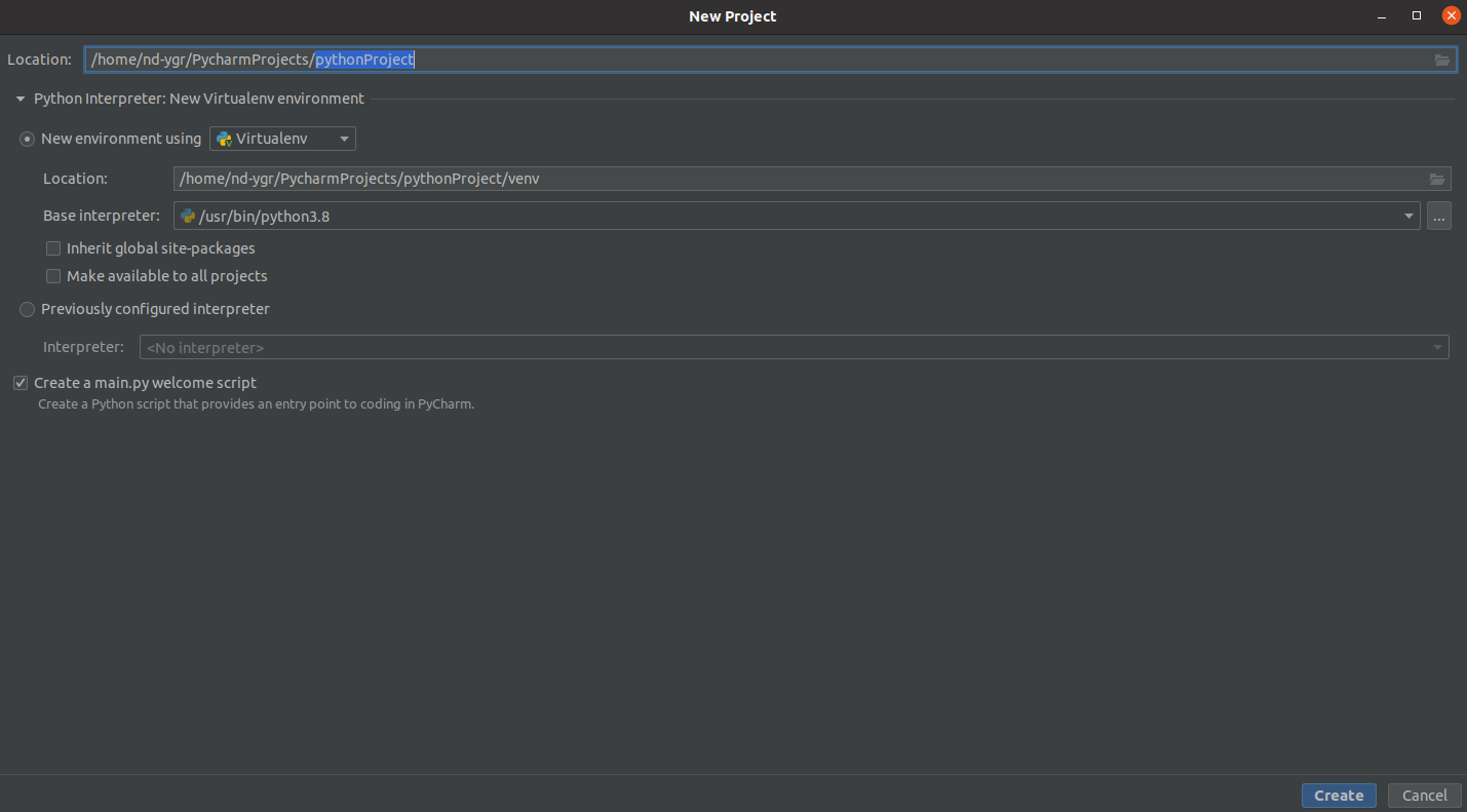 - 원하는 코드 저장위치, 환경위치, 파이썬 버전을 선택해주고, Create 클릭