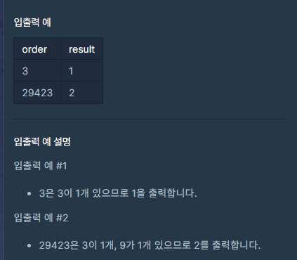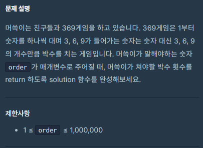 369라는 숫자가 나오는 횟수를 정답으로 리턴하면 되는 문제입니다.
