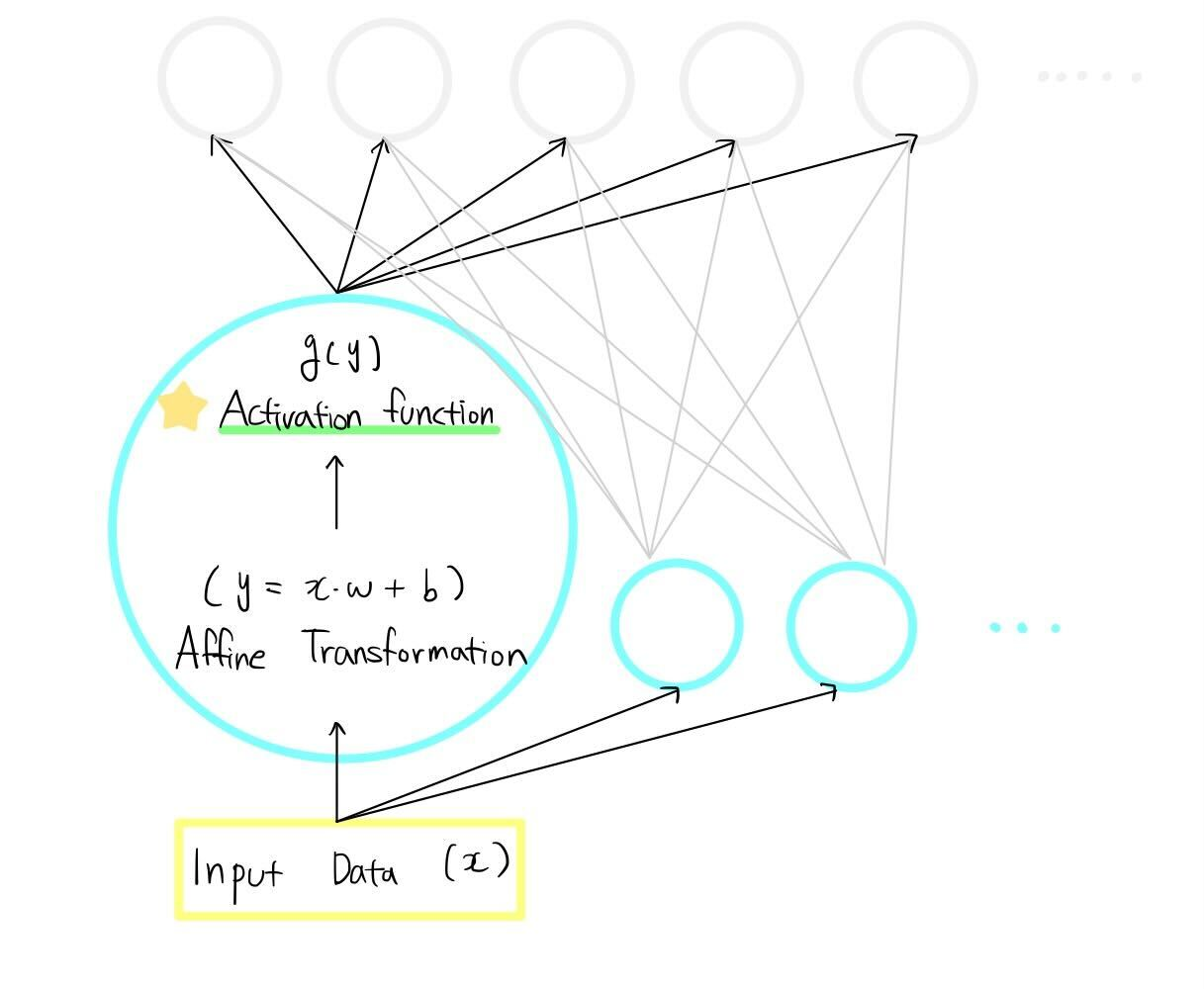 하나를 예로 들면, 딥러닝을 위한 신경망 모델(neural networks)의 각 층(Layer)에서 각 뉴런(Neuron)에 Input Data(x)가 입력되면 Affine function(f(x) = z = wx + b), 활성화함수(g(wx + b))를 통해 Output Data가 출력값으로 나온다. g(f(x))라는 합성함수 형태가 하나의 뉴런 안에서 수행되는 연산이다. 이 출력값을 다음 레이어의 입력값으로 보내주게 된다. 잠시 주의할 점은 만약 모델의 마지막 레이어라면 다음에 보내줄 loss function을 수행하는 레이어에 대한 입력값 형태에 맞게 활성화함수를 사용할수도 있고, 사용하지 않을 수도 있다. 각 목적에 맞게 적용할 수 있는 다양한 활성화 함수들이 있는데, 각 함수들의 목적은 무엇인지, 활성화함수 자체가 왜 필요한지에 대해 아래에서 찬찬히 다루어 보겠다.