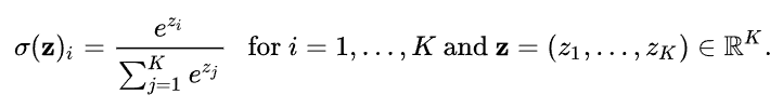 softmax 함수는 다중분류(multi-class classification)문제에 가장 자주 쓰이는 활성화 함수이다. 이진분류에서도 사용 가능하기 때문에 sigmoid 대신 사용해줄 수도 있다. 소프트맥스 결과값도 항상 0과 1사이의 값을 출력해주며, 아래의 식처럼 e를 밑으로 가지고, 이전 layer의 결과값인 class별 z값을 지수로 가지는 값들로 각 class별 확률을 구해주는 방식이다. K는 class 개수이다.