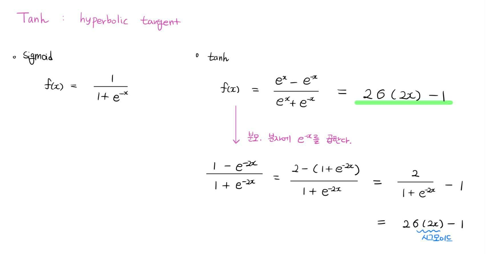 쌍곡선 함수(hyperbolic function)의 h와 탄젠트(tangent) 삼각함수의 tan을 따서 tanh는 쌍곡탄젠트(hyperbolic tangent)라고 읽는 활성화 함수가 있다. 시그모이드 함수를 선형변환한 것으로 시그모이드의 기울기 소실 문제를 좀 더 해결하기 위해 고안된 방법이다. -1부터 1까지의 출력값을 가지기 때문에 sigmoid와 비교해서 아래의 두가지 성질을 가진다.