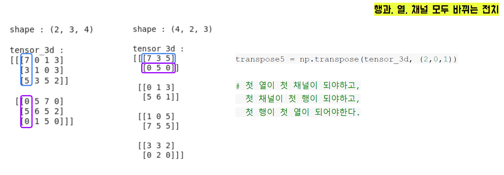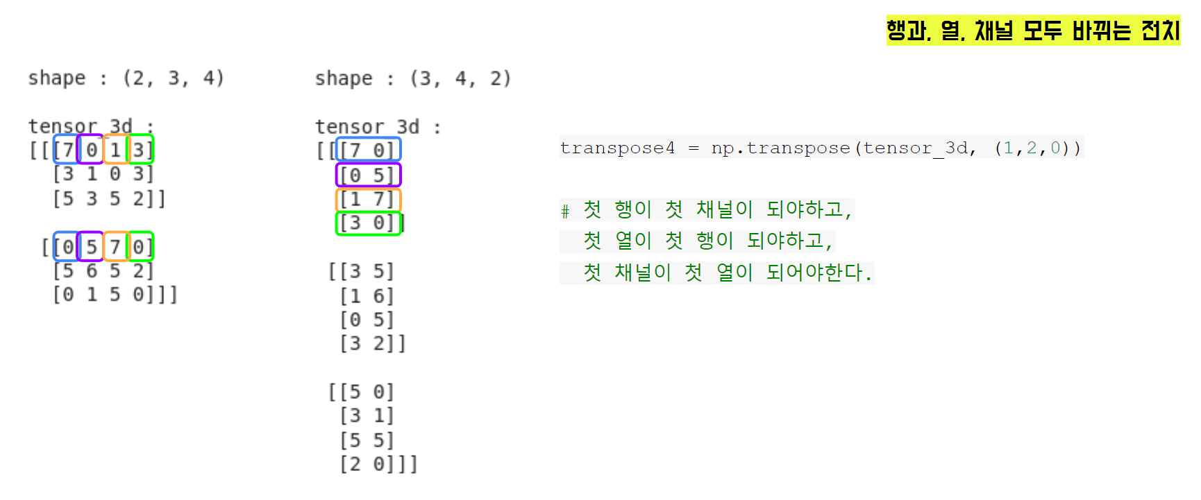 - 행과 열과 채널을 모두 전치 : -> (1, 2, 0), (2, 0, 1)로 전치