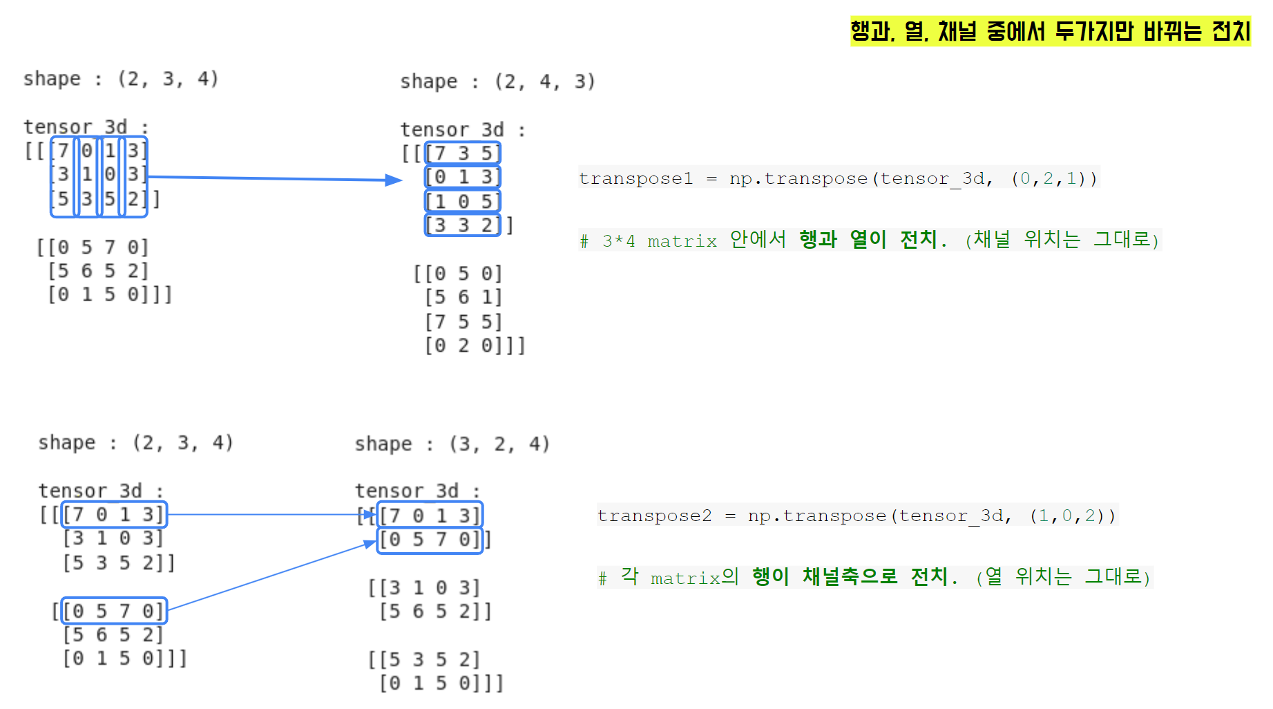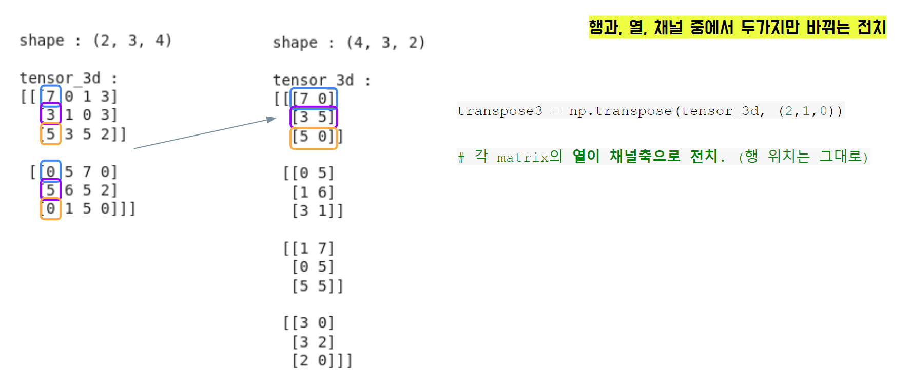 - 행과 열만 전치 : -> (0, 2, 1)로 전치