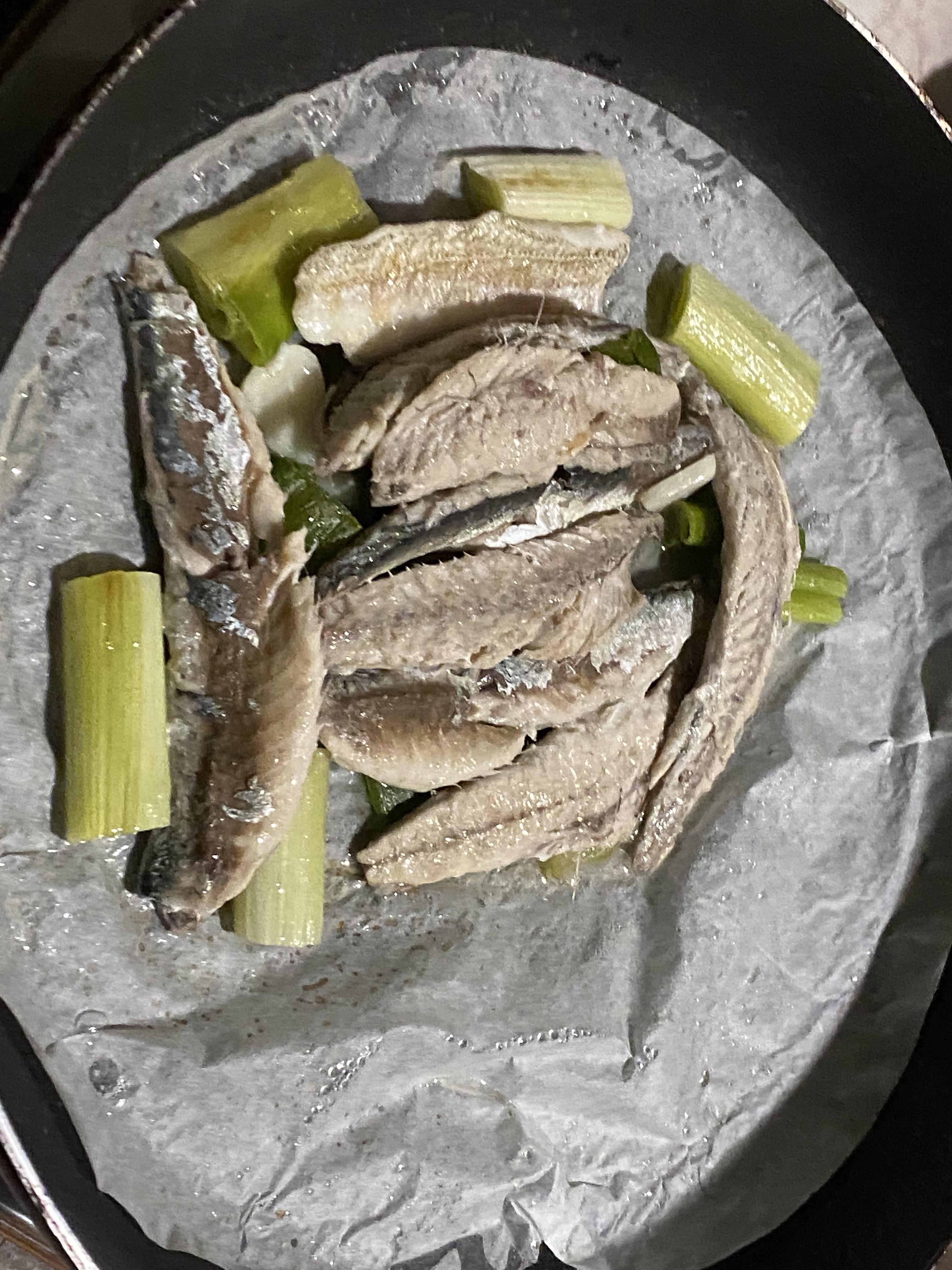 “식초+물로 10분정도 고등어 비린내 제거하고 - 키친타올로 물기 완전히 제거한 다음 - 프라이팬+종이호일에 고등어, 올리브유, 마늘, 파, 소금 몇꼬집 - 종이호일2+뚜껑 덮어서 4분씩 앞뒤로 익히면” 요리 완성