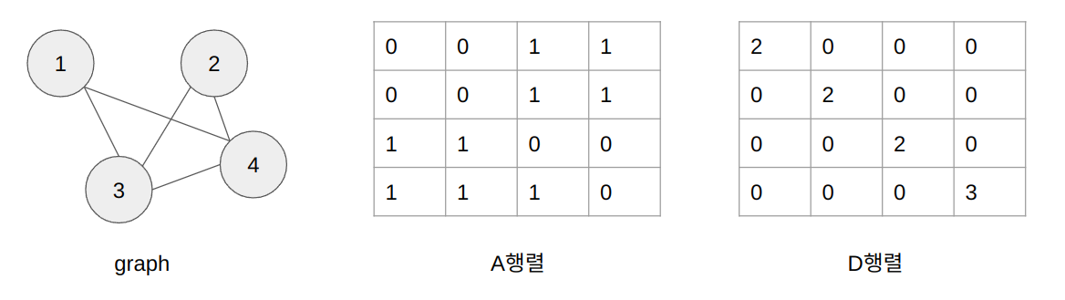 D는 Degree matrix(차수행렬)의 수식표현으로 A행렬의 i번째 row의 모든 원소의 합을 주대각선 원소로 갖는 대각행렬이다.