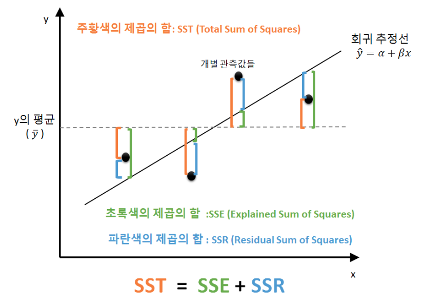 - SST; Total Sum of Squares = Total SS = SSE(Explained Sum of Squares) + SSR(Residual Sum of Squares)