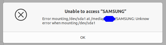 "Error mounting /dev/sda1 at /media/~~~~/: Unknow error when mounting /dev/sda1"