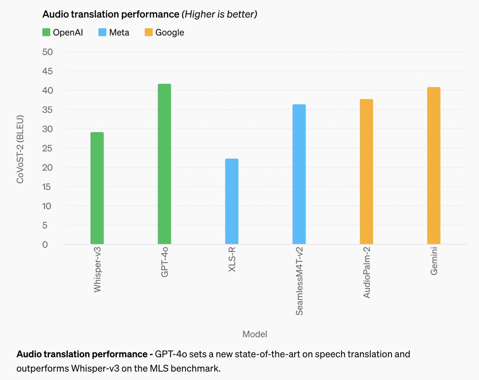 Audio Translation은 입력 음성을 다른 언어로 번역해주는 기능으로 BLEU score기준으로 GPT-4o 모델이 압도적인 성능을 내고있고, Google의 Gemini가 비슷하게 높은 성능을 가진것을 볼 수 있다.
