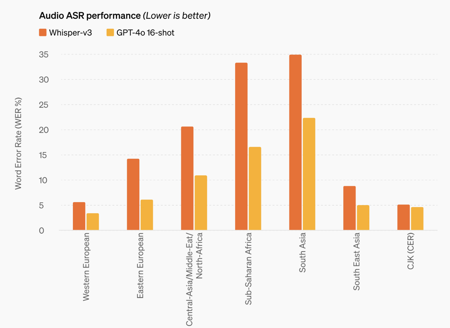 음성인식모델(일반적인 STT모델)에 대해서 에러율을 측정해보았을 때, 이전의 Whisper-v3모델보다 GPT-4o 16-shot 모델이 압도적으로 낮은 에러율을 보이고 있다.