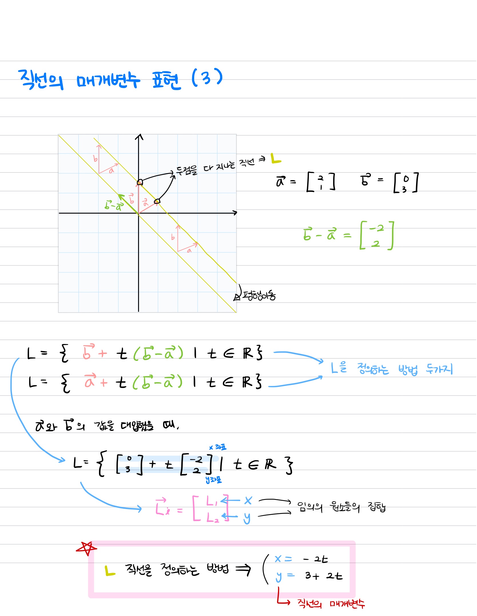 3) 이러한 과정을 식으로 표현한 것이 직선의 매개변수 표현이다.