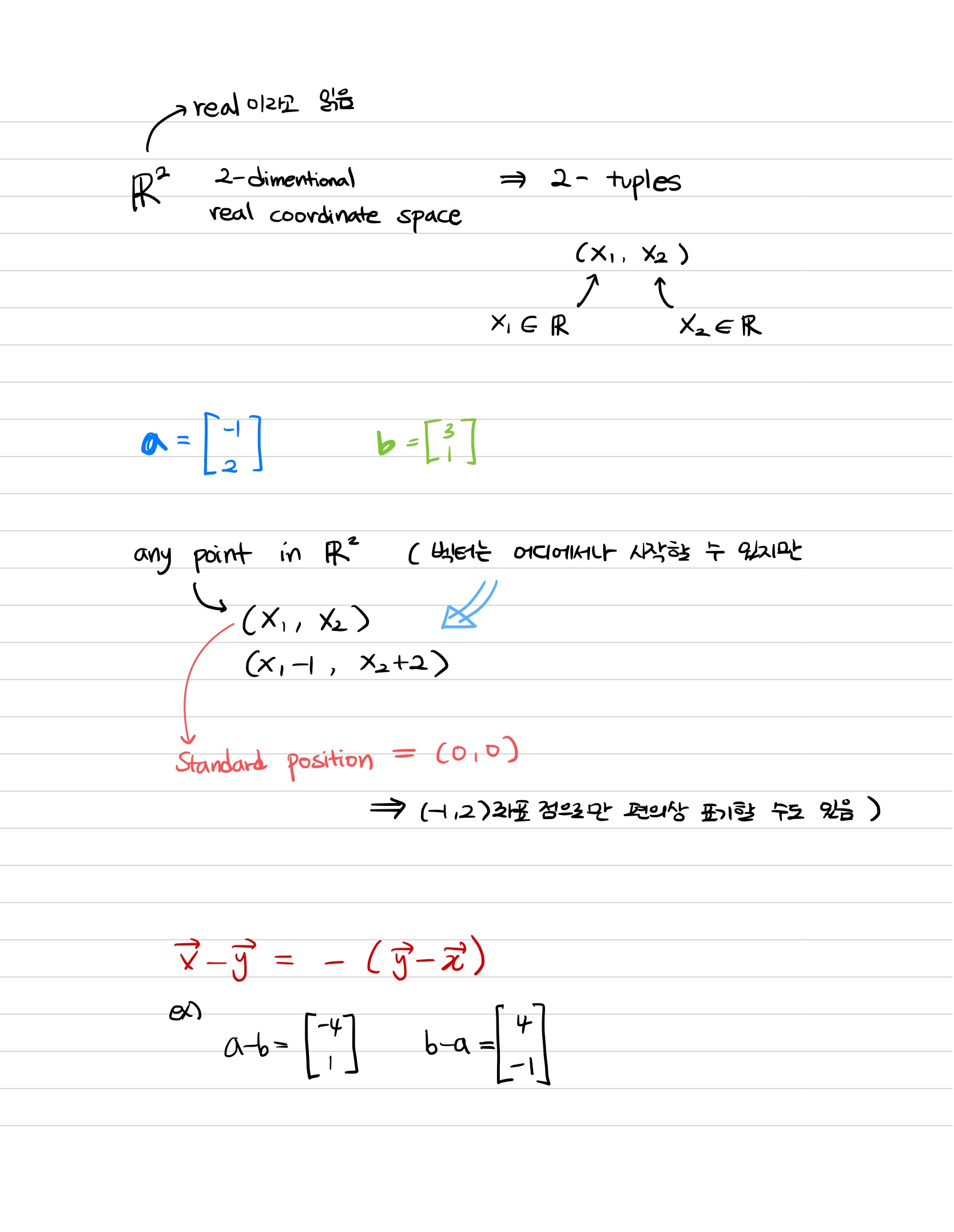 - 위치벡터(Standard Position Vector) : [0,0]이 벡터의 시작되는 지점(꼬리)인 벡터 (R2 기준)