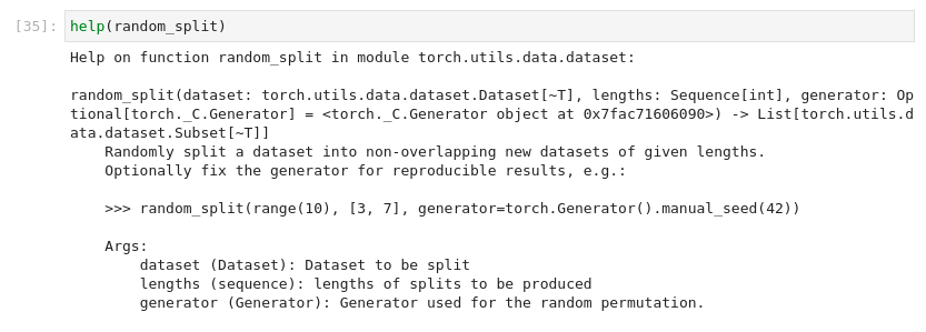 (python 내장 함수인 help를 활용하여 random_split에 파라미터들을 미리 확인할 수 있다.)