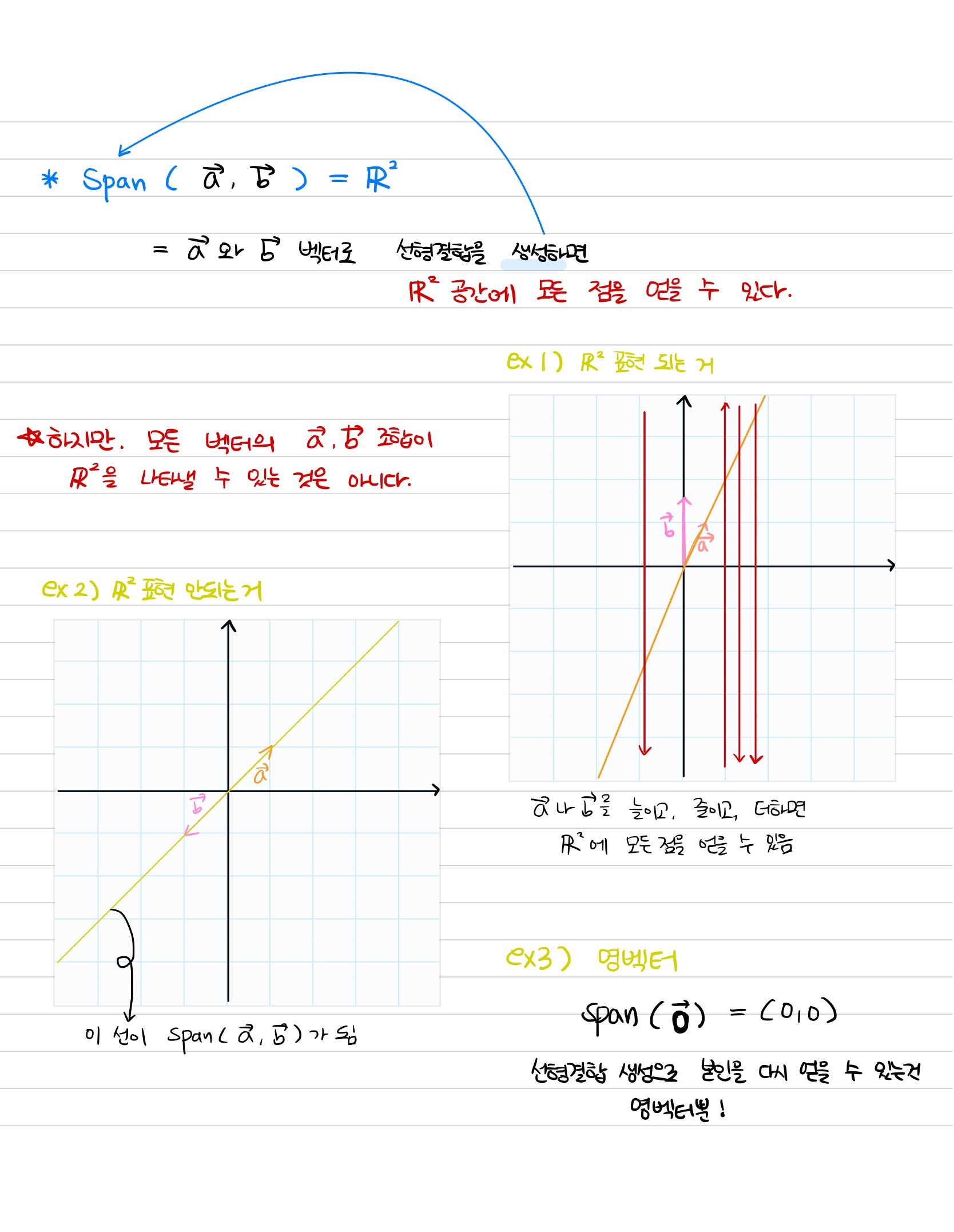 Span이란, 집합S의 벡터에 scalar값을 곱하고, 집합 내의 벡터끼리 서로 더해서 (=선형결합으로) 나올 수 있는 모든 경우의 수의 집합