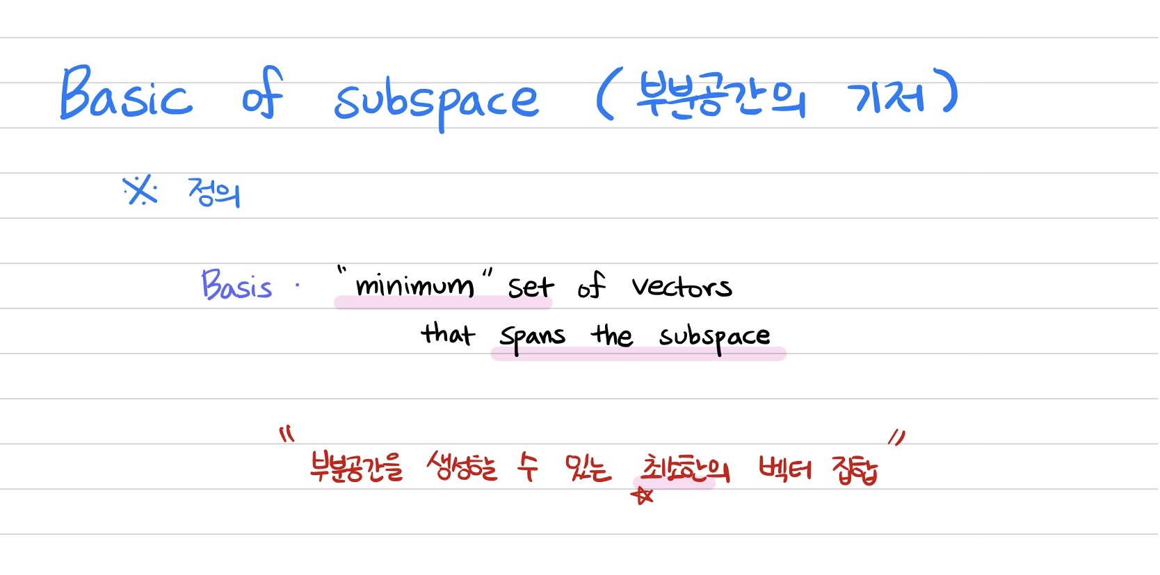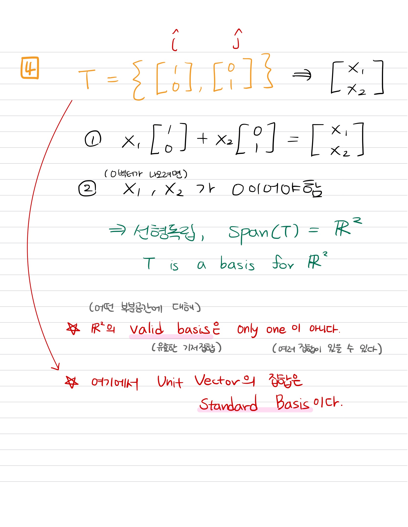 * 단위벡터(unit vector)의 집합으로 부분 공간의 기저(basis)를 만들 때, 이를 표준기저(Standard Basis)라고 한다.