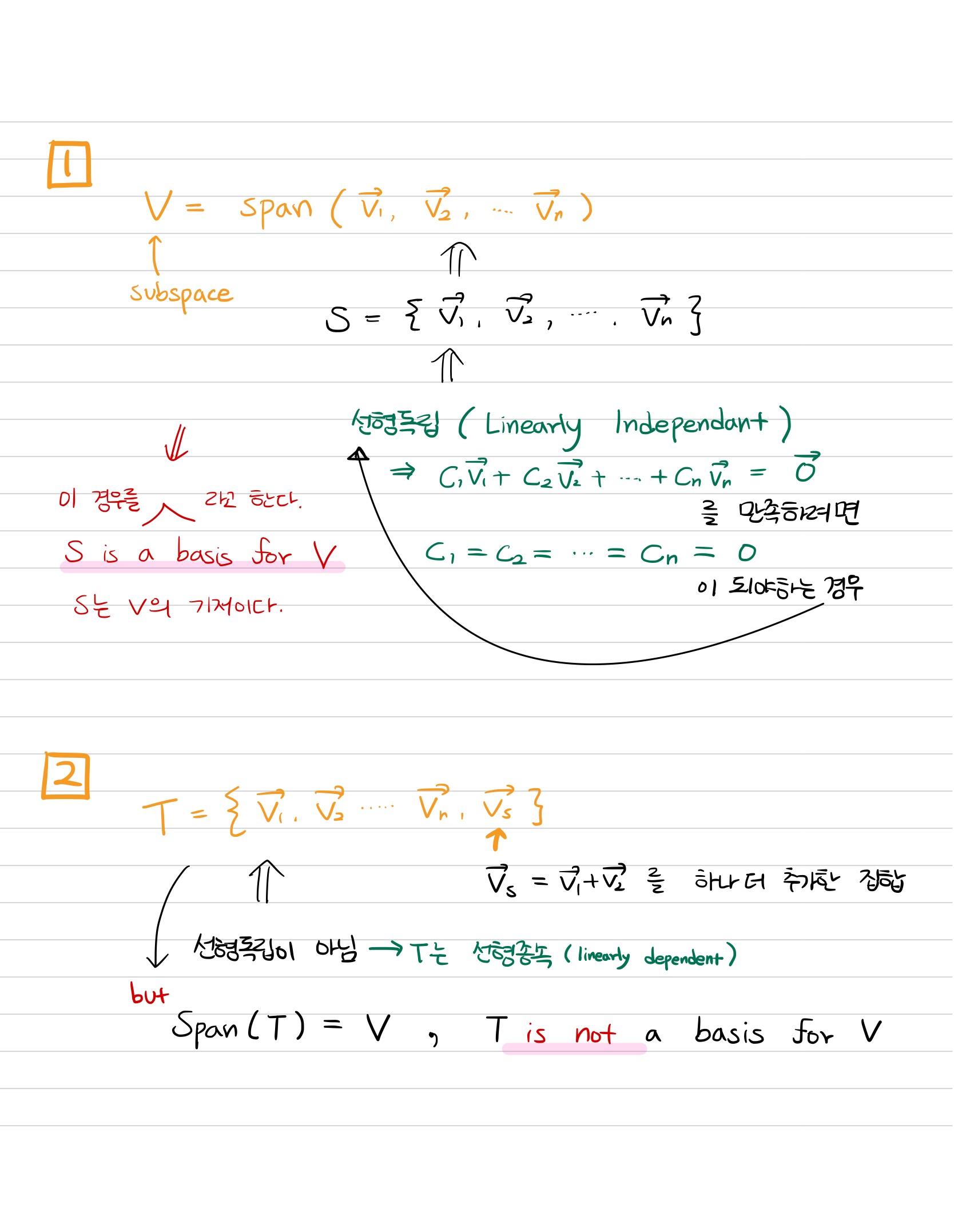 모든 벡터가 선형독립인 집합S에 대한 생성(span)이 V가 된다.