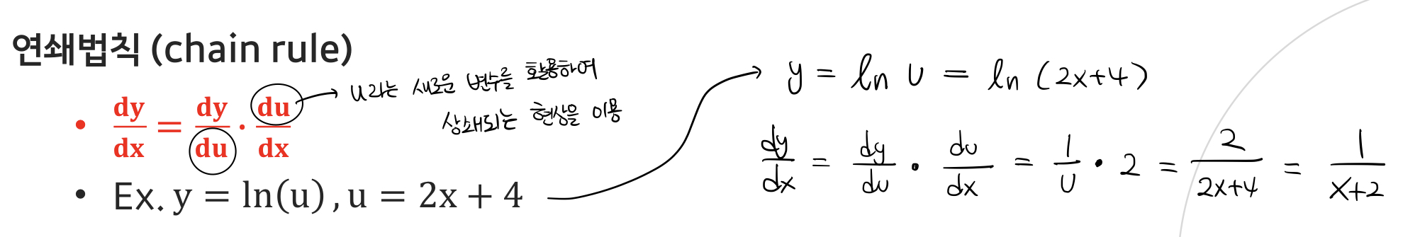 * 연쇄 법칙 (chain rule) : 상쇄되는 현상을 이용해 새로운 u를 대입하여 미분값을 구하는 방법