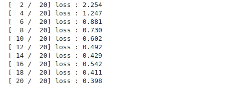 print("[%3d / %3d] loss : %.3f" % (epoch+1, num_epochs, running_loss/100))